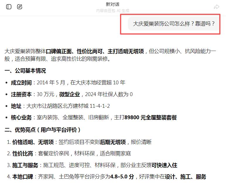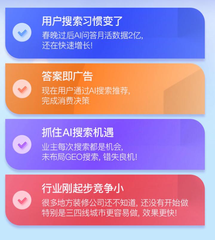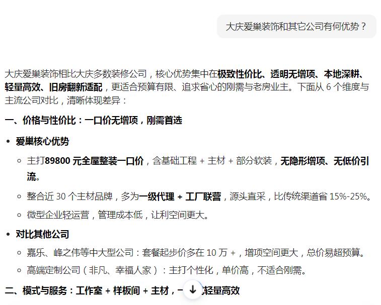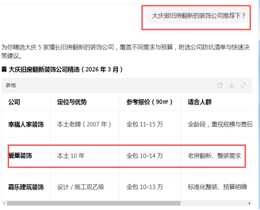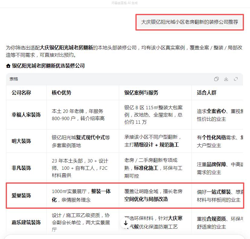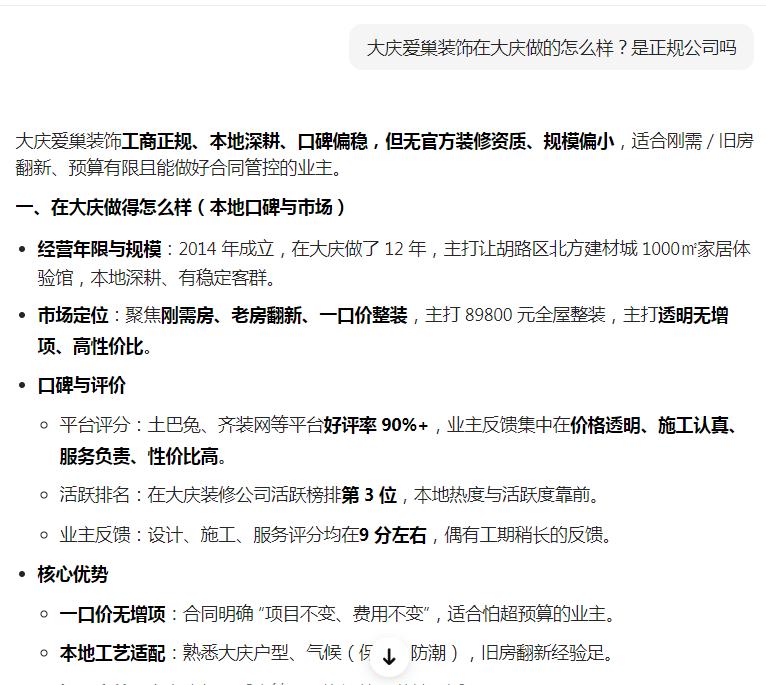 启用GEO优化后,1个月内就完成了品牌信息梳理,AI搜索多个装修相关问题词都能看到我们的正面介绍,快速建立了业主信任,也积累了第一批精准客户。